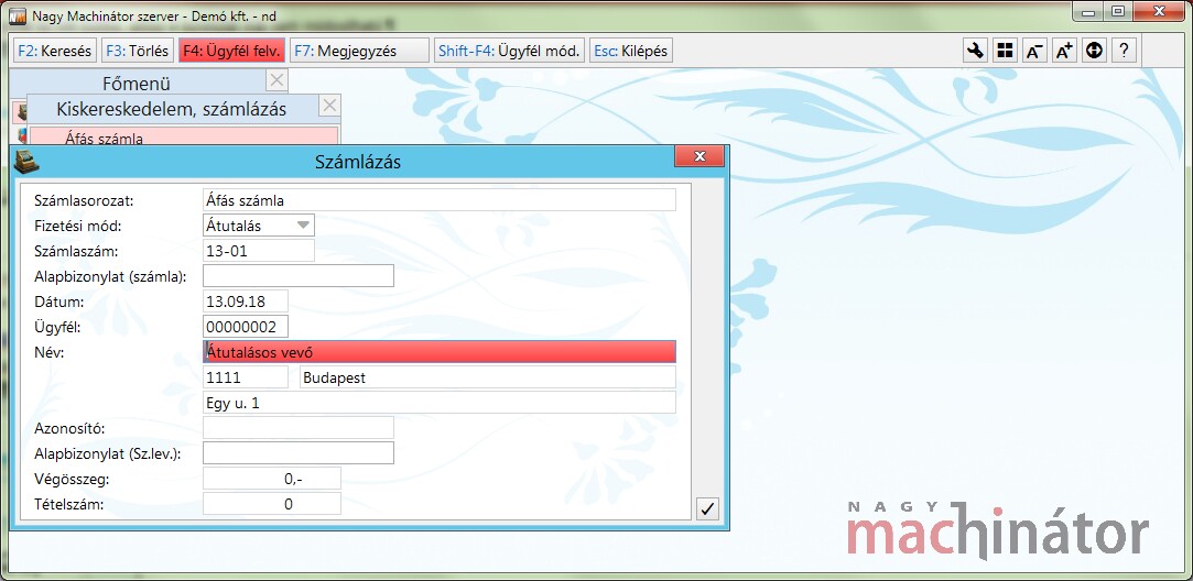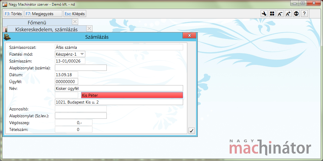 Amennyiben a számlát kérő ügyfelet nem akarják az ügyféltörzsbe rögzíteni, akkor az ügyfél mezőbe 00000000-ás ügyfélkódot kell megadni. Ezek után lehetőség lesz az ügyfélnevének és címének megadására. Az ügyfél ugyan nem lett felvéve az ügyféltörzsbe, de a számlához el lett tárolva az adat. Amennyiben visszatérő vevőről van szó, nem érdemes ezt a módszert alkalmazni!