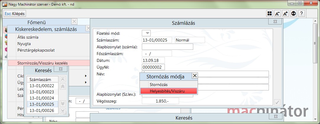 A képen látható menüpontban történik a számla stornírozása.