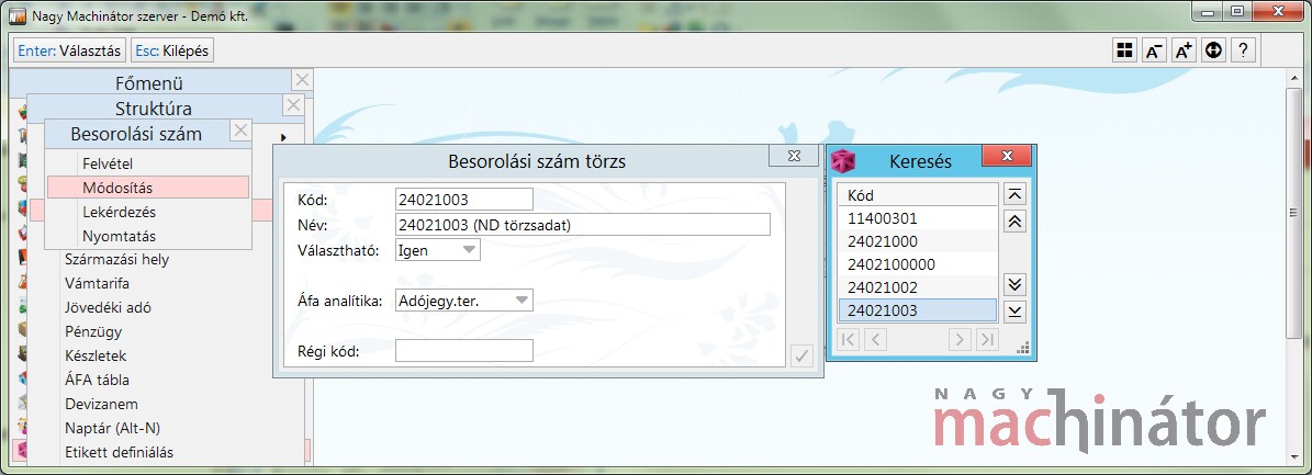 A betöltés a Besorolási szám törzsbe felveszi a törzsadatokban előfordult vámtarifaszámokat és beállítja a megfelelő áfakódot és áfaanalitikát.