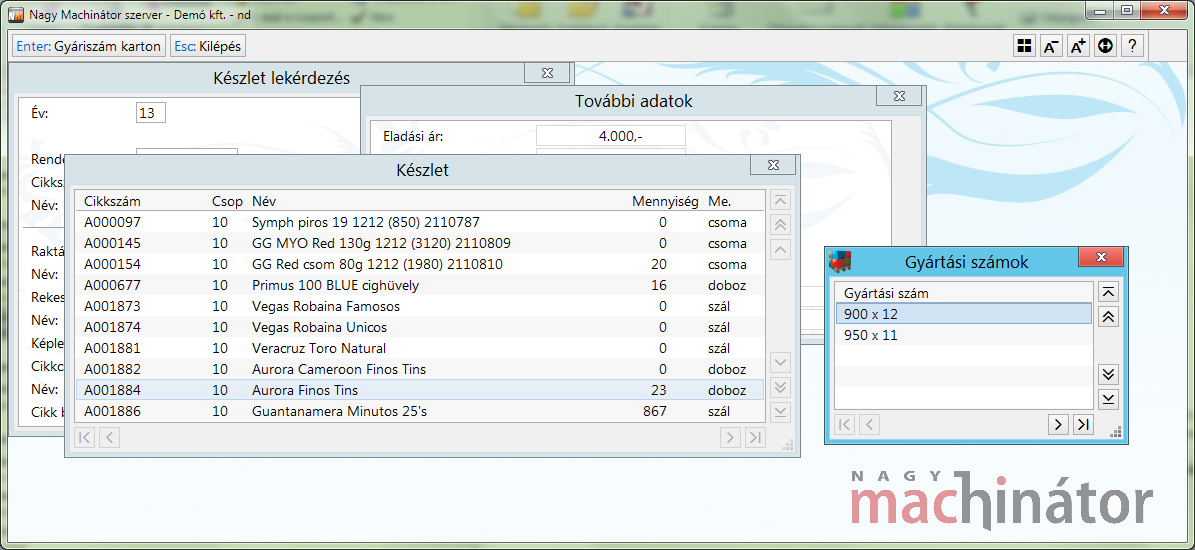 A Nagy Machinátorban megoldott az Árszint kérdése. Az Árszint a programba épített gyártási szám kezeléssel lett megoldva.