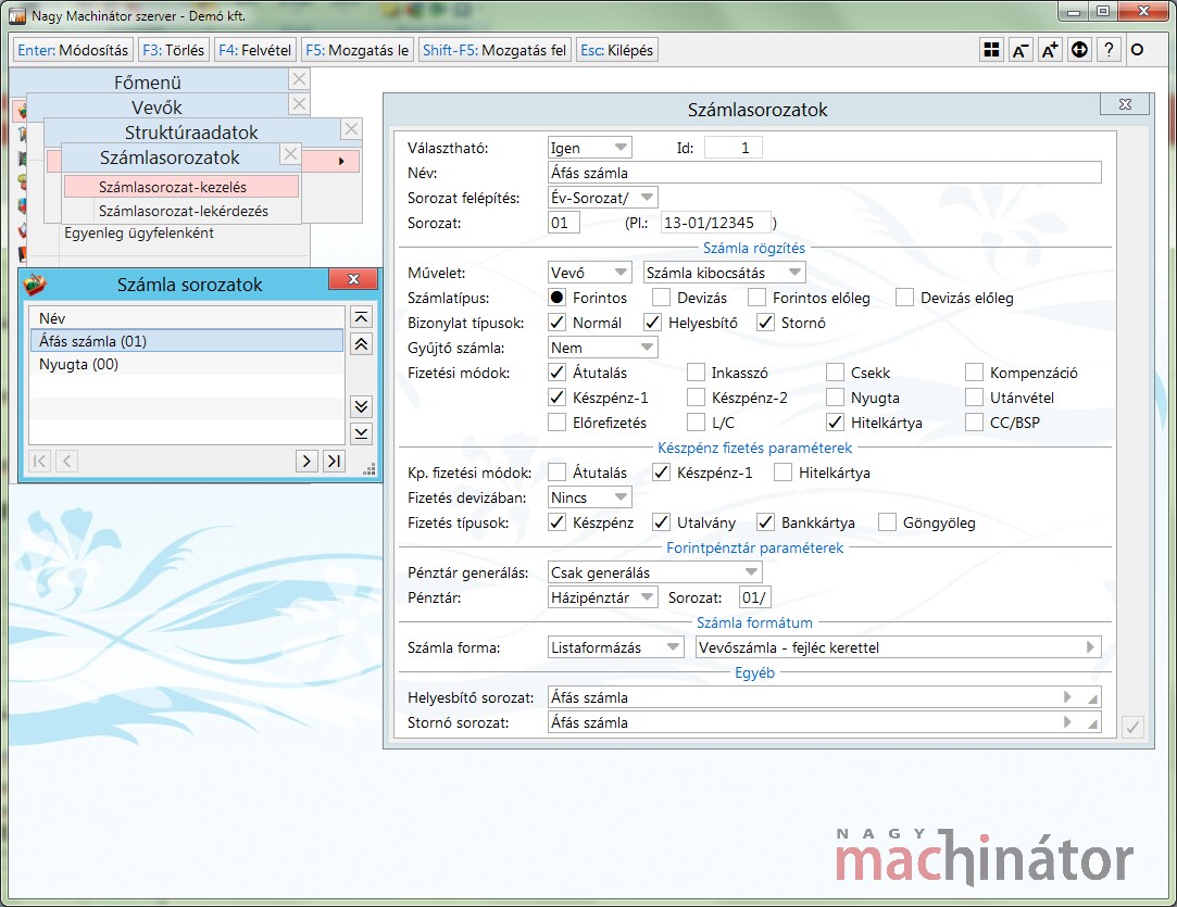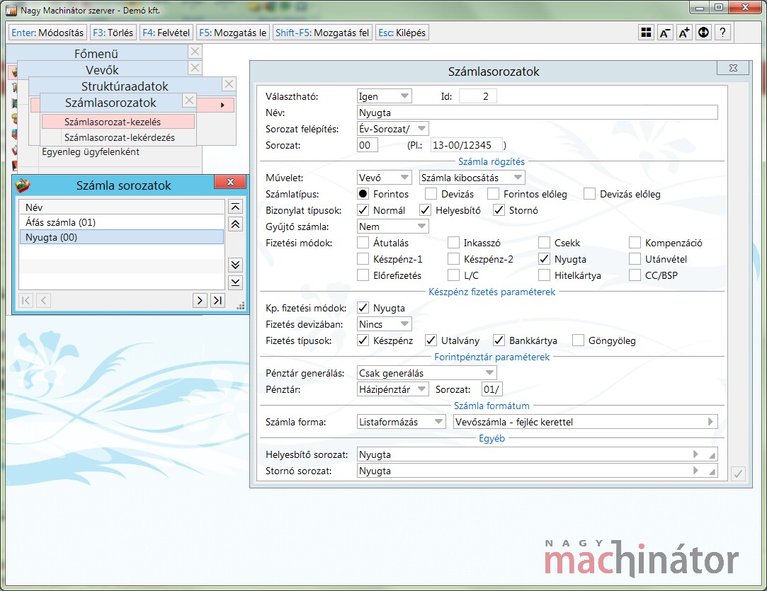 A számlasorozat menüpontban kell a képen látható rekordot rögzíteni (BIGMAC menü)