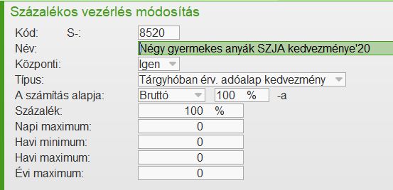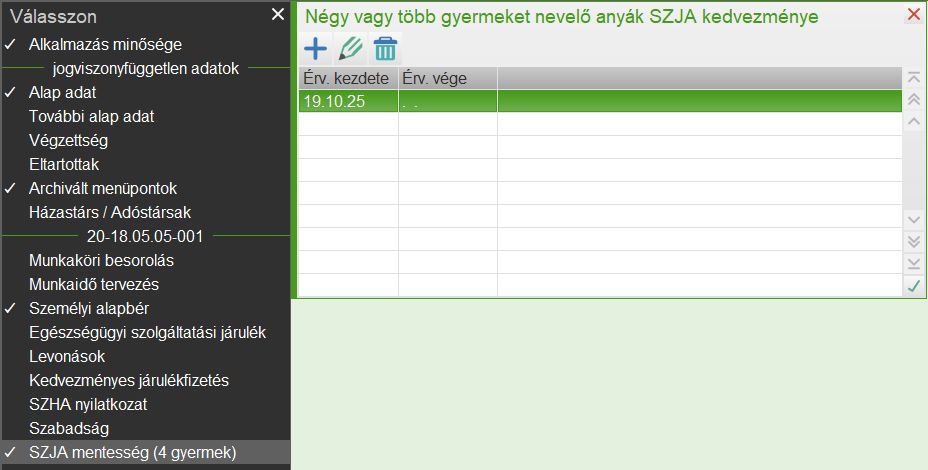 Azon dolgozóknál, akik nyilatkozatot adnak le arról, hogy jogosultak a kedvezmény igénybevételére, náluk a Személytörzs / SZJA mentesség (4 gyermek) menüpontban fel kell rögzíteni a jogosultság kezdetét, valamint, ha úgy alakul, akkor a jogosultság végét is meg lehet adni.