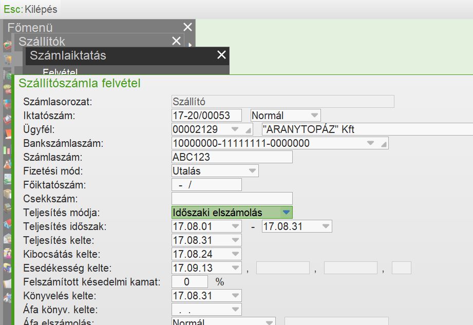 A szállító (és belföldi devizás import) számlák beviteli ablakában is lehetőség van megadni Időszaki elszámolást, mint teljesítési módot, és -tól-ig dátumot, hasonlóan a vevőszámlákhoz. A számlaszűrés bejövő számlák esetén is kezeli a teljesítési időszak szűrést. |