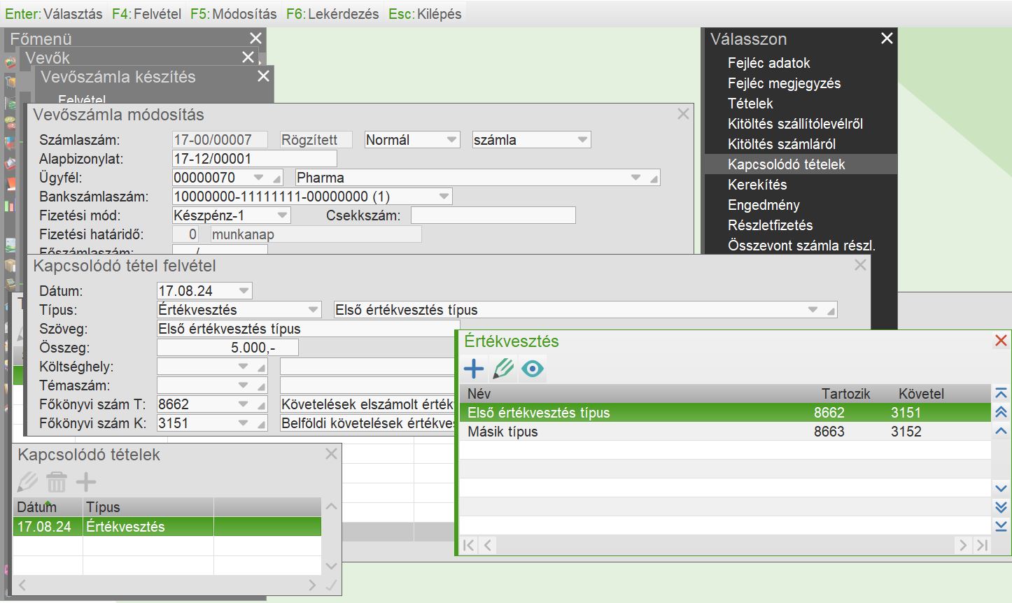 Értékvesztés típusok hozhatók létre, mellyel a vevőszámlák kapcsolódó tételében elérhető, hogy különböző kontírozással lehessen létrehozni értékvesztéseket. |