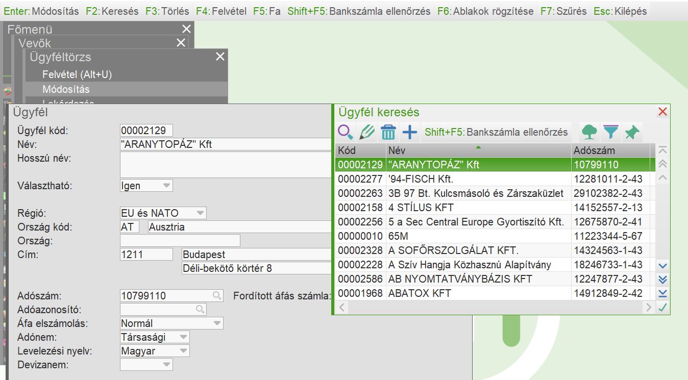 Az ügyféltörzs keresés is (a cikktörzs és a számlatükör keresés mintájára) grides lett, valamint a keresőgridből elérhetők a szűrések. Amennyiben az alapértelmezetten megjelenő hagyományos keresőablakból kivesszük a "Keresés előtt megjelenik" pipát, akkor eleve a keresőgrid jelenik meg. Visszakapcsolni a gridből az F2:Keresés gombra megjelenő keresőablakban lehet. |
