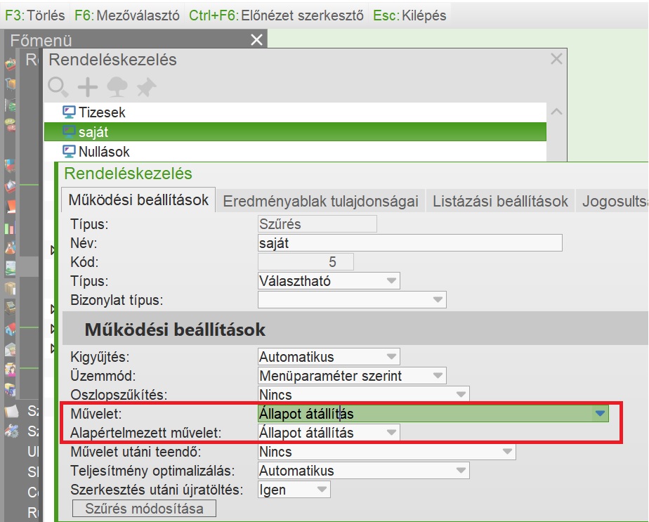 Új művelet készült a rendelés szűrésbe, mellyel a kijelölt bizonylatok tételeiben cserélhetjük le a megadott állapotú elemeket egy másik állapotra. |