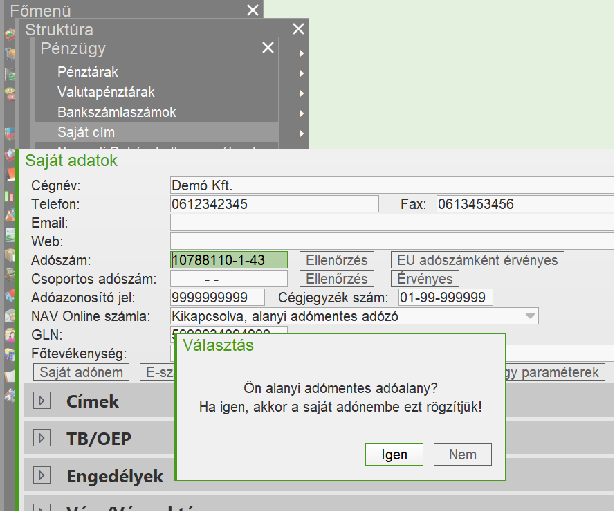 Új ellenőrzések kerültek a Saját címbe az adószámokkal és a NAV Online számlaküldéssel kapcsolatban, melyekkel biztosítható, hogy a kezelt cég különböző adószámai korrektek legyenek, ill. a NAV Online számlaküldés beállítását is szabályozhatjuk az adószám függvényében (pl. Alanyi adómentes cég). |