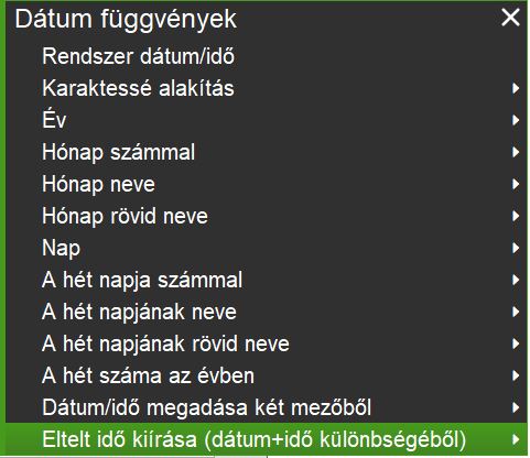 Új dátum függvények készültek a listaformázóba, melyek a dátum mellett az időt is megjelenítik (rendszerdátumnál is lehetséges), ill. két dátumból (amely időt is tartalmazhat) különbség képezhető nap, óra, perc, vagy másodperc részletezettséggel. |