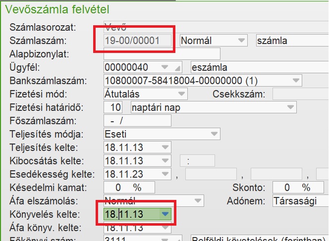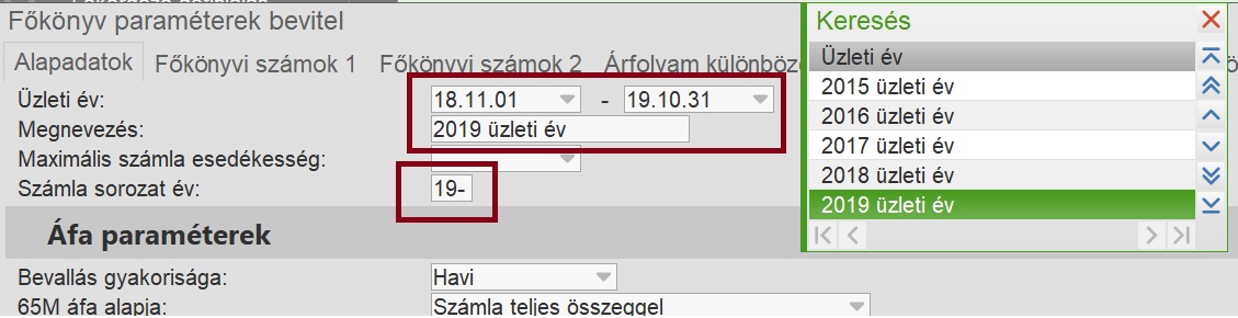 A Főkönyv paraméterekben az Alapadatok fülön beállítható, hogy az adott üzleti évben az év-sorozat, ill. a sorozat-év típusú számlaszámokban mi legyen az év értéke. Üresen hagyva a számla könyvelési dátuma alapján határozza meg a program, kitöltve ez az érték lesz a számlaszámban. Naptári évhez képest eltolt pénzügyi évnél lehet használatos a funkció, amivel pl. beállítható, hogy egy 2018. november 1-től kezdődő üzleti évben már ne "18" legyen a számlaszámban, hanem mondjuk "19". |