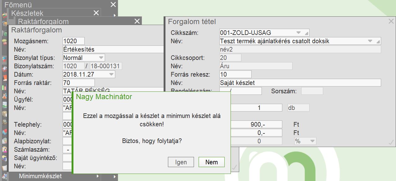 A Mozgásnem törzsben megadható, hogy az adott mozgás figyelje-e egy cikk minimum készletét. Ha be van kapcsolva, és az adott raktárban a cikk a megadott érték alá csökken (akár az éppen kivezetett mennyiséggel, akár már a mozgás előtt az alatt volt), figyelmeztetés jelenik meg. A figyelmeztetést elfogadva ki lehet vezetni a cikket. |
