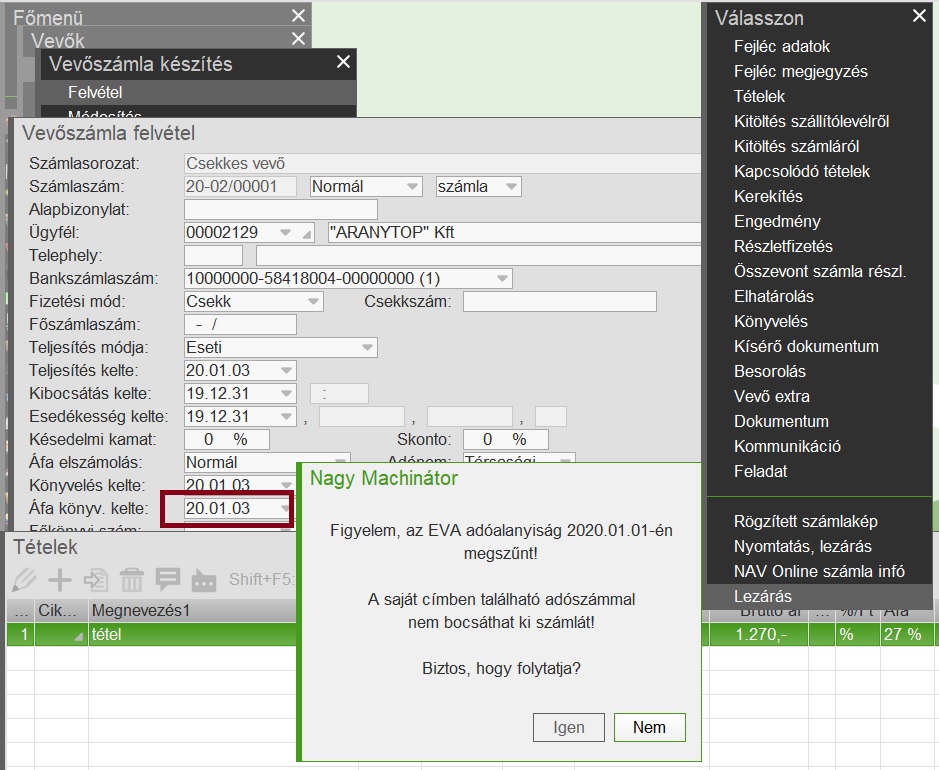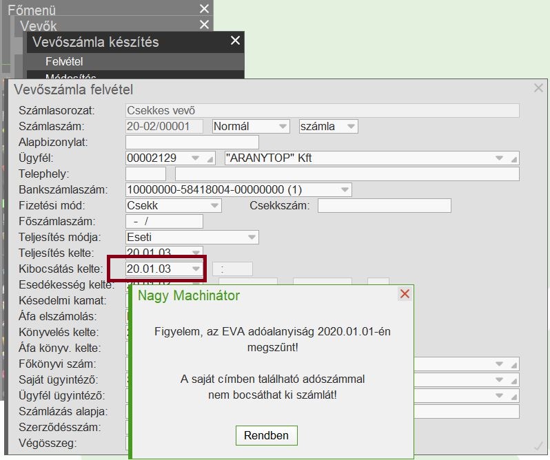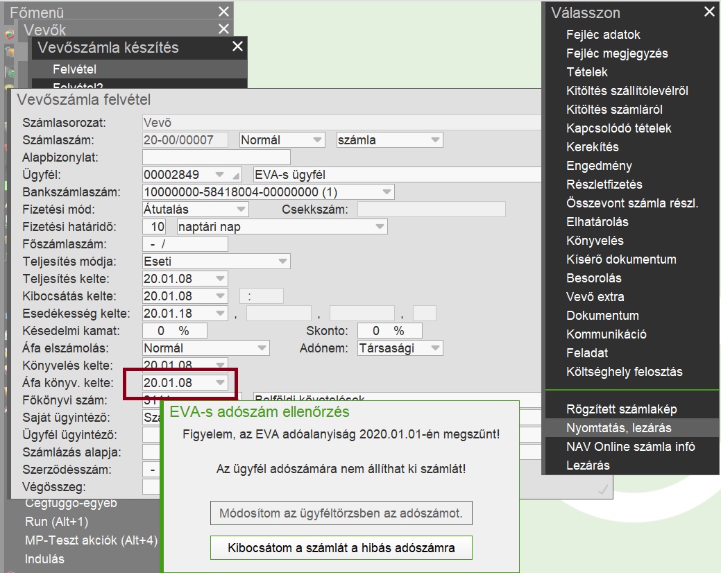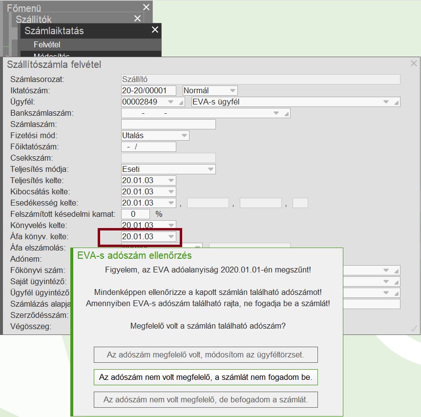 2020.01.01-vel megszűnt az EVA, így a korábbi EVA adóalanyoknak át kellett térni más adózási típusra, ezzel egyidőben változnia kellett a saját vagy az ügyfelek adószámának. Számlakibocsátásnál három ellenőrzés fut le: 1. A Vevő, Szállító (önszámla), Külkereskedelem (Export, ill. Import önszámla) és a Kiskereskedelem modulokban nem lehet 2020.01.01. vagy ezt követő kibocsátás dátummal kibocsátani számlát, ha a saját adószám 9. karaktere 3-as. 2. Ezen kívül a Vevő és Export modulokban ha az áfa dátuma 2020.01.01. vagy ez utáni, a program lezáráskor figyelmeztet, ha a saját adószám 9. karaktere 3-as. Ekkor választhatunk, hogy ennek ellenére lezárjuk (kinyomtatjuk) a számlát vagy mégsem és javítjuk a saját adószámot. 3. A Vevő és Export modulokban ha az áfa dátuma 2020.01.01. vagy ez utáni, a program lezáráskor figyelmeztet, ha a vevő adószámának 9. karaktere 3-as. Ekkor választhatunk, hogy ennek ellenére lezárjuk (kinyomtatjuk) a számlát vagy mégsem és javítjuk az ügyféltörzsben a vevő adószámát. Befogadott számlák esetében: A Szállító és Import modulokban ha az áfa dátuma 2020.01.01. vagy ez utáni, a program figyelmeztet, ha a szállító adószámának 9. karaktere 3-as. Ekkor választhatunk, hogy módosítjuk az adószámot az ügyféltörzsben (a számlán már a 2020-ra érvényes adószám van), vagy nem fogadjuk be a számlát, ill. ennek ellenére befogadjuk. |