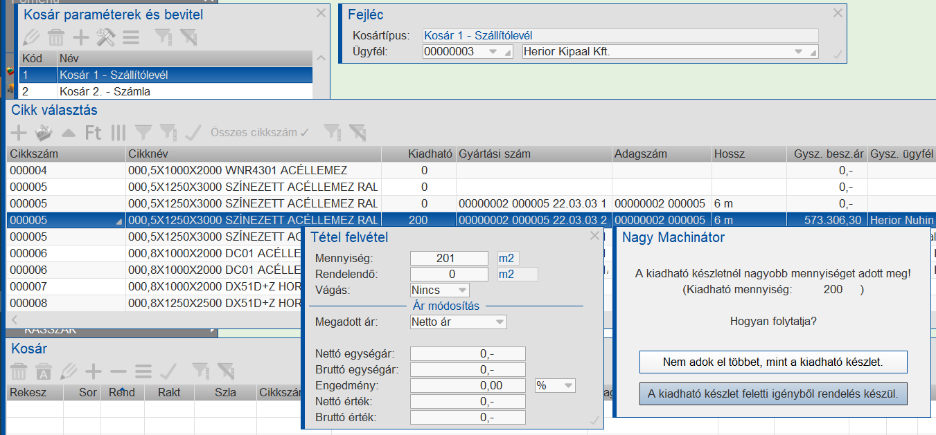 Az értékesítés során előfordulhat, hogy a vevő nem minden igényét nem lehet a készletről kiszolgálni, de a rendelési igényét le szeretné adni. A Kosár funkcióban elérhető, hogy a kosárba rakás során a felhasználó kérhesse, hogy a rendelkezésre nem álló készletből rendelést vegyen fel a program. Ezzel lehetővé válik, hogy a funkcióból történő kilépés nélkül lehessen egyszerre szállítólevelet és rendelést rögzíteni. - További információ |