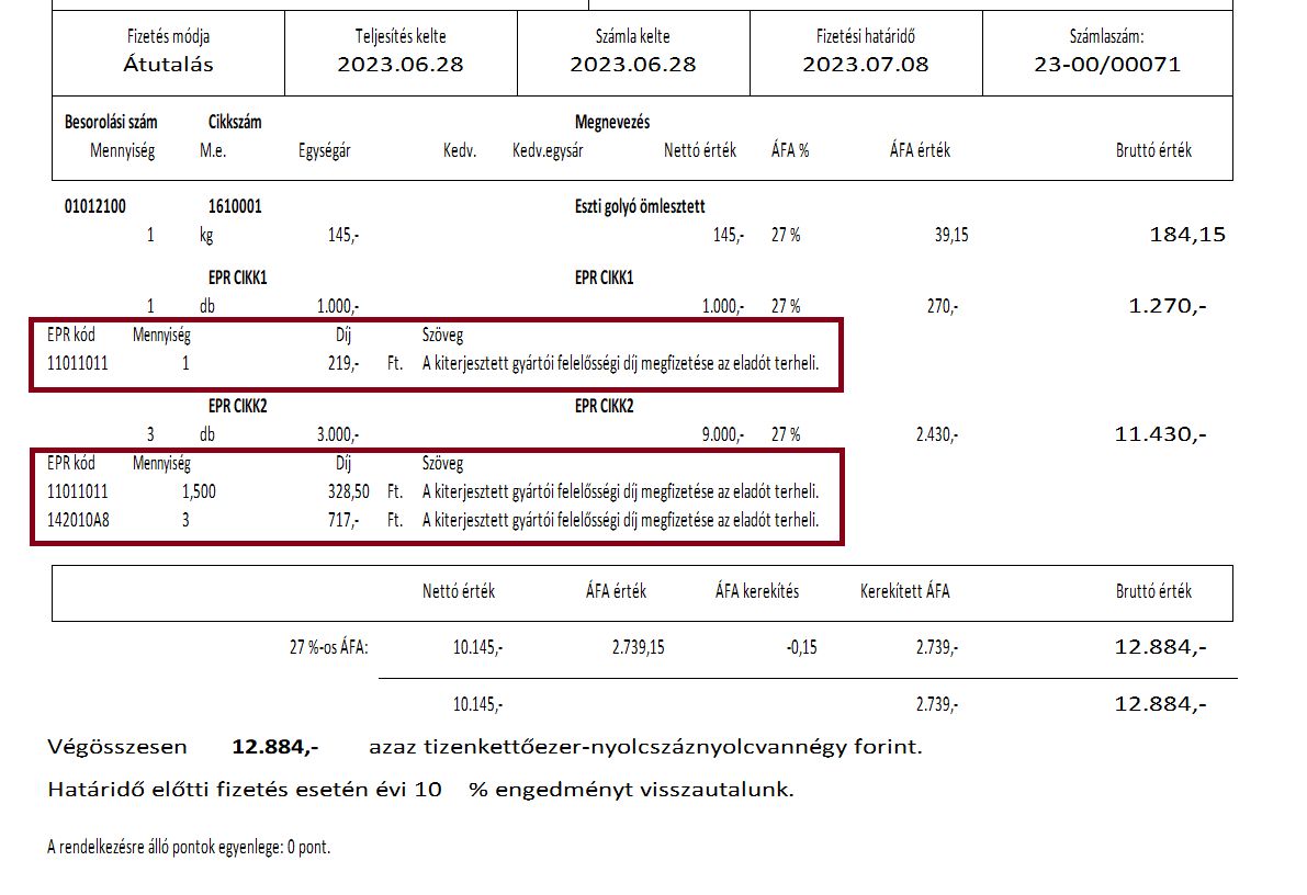 2023. július 1-jétől életbe lép az EPR szabályozás. Az érintett cikkekhez rögzíteni kell az EPR törzsből díjkódot, mely alapján az értékesítési számlán megjelenik a díj megfizetését igazoló szöveg, pl. |