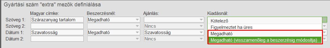 Pontosítva lett a gyártási számok tulajdonságait eltároló algoritmus. Alapvetően annak a helyzetnek a kezelése lett pontosítva, amikor a gyártási számhoz tartozó kémiai vagy fizikai tulajdonság a termék élete alatt megváltozhat, és ezért arra van szükség, hogy kiadás esetén méréssel pontosított értéket lehessen megadni. További feltétel, hogy a tulajdonság megadása ne változtassa meg a korábbi beszerzések, eladások értékét. Gyártási szám tulajdonságokban a Ki irányú mozgások esetén a következő két értékkel lehet szabályozni a működést: Megadható esetén figyelmeztetés nélkül is üresen lehet hagyni, de megvan a lehetőség a kitöltésére, vagy a módosítására. Ebben az esetben a gyártási szám korábbi mozgásai nem változnak meg. Megadható (visszamenőleg a beszerzésig módosítja): az előző értékhez képest annyi a különbség, hogy a korábbi kiadásoknál és a beszerzésnél megadott értéket felülírja a program az utoljára megadott értékkel! Ennek az értéknek a használata akkor javasolt, amikor az érték már a beszerzésnél is rendelkezésre állt volna, de valamilyen ügyviteli ok miatt a pontos érték megadására nem volt lehetőség. (Például a bevételezés során a raktárosnál nincs mérő műszer.) Példa.: Szöveg1-ben a Szárazanyag tartalom szerepel százalékban Beszerzéskor a Szárazanyag tartalom 45% Eladáskor megmérik és 50%, átírják az értéket. Következő eladáskor megmérik és már 55%, átírják. Megadható (visszamenőleg a beszerzésig módosítja) esetén minden korábbi érték átíródik, és elveszik az információ. Megadható esetén nem íródnak át a korábbi adatok. A Gyártási szám készlet állomány viszont a legutóbb megadott értéket fogja tartalmazni. Vagyis ha a készletet nézik már azt látják, hogy 55%-os a termék, mert a legutolsó mérés alapján feltételezhetjük, hogy még mindig annyi.