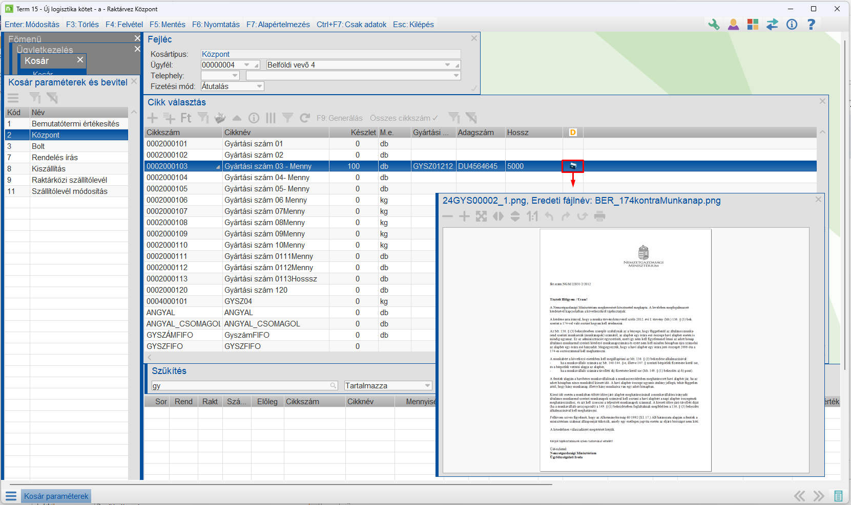A Kosár funkció új lehetőséggel egészült ki. Egyedi azonosítóval ellátott termékek értékesítése során hasznos segítség lehet a konkrét termékhez tartozó műbizonylat (vagy egyéb tanúsítvány) az ügyintéző megtekintése. Az új fejlesztés alkalmazásával elérhető, hogy a gyártási számhoz tartozó dokumentumok megtekinthetők legyenek a termék kiválasztása során. |