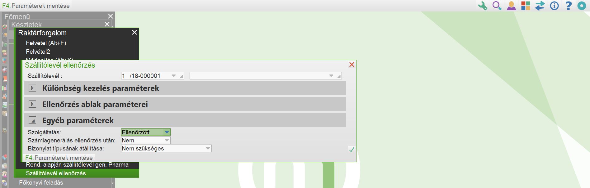A Szállítólevél ellenőrzése funkció Egyéb paraméterek blokkjában új kapcsoló: Szolgáltatás=Nem ellenőrzött/Ellenőrzött. Ellenőrzött értékkel futtatva az akciót a szállítólevélen szereplő szolgáltatás típusú tételek azonnal az ellenőrzött ablakba kerülnek. A működés a hasonló nevű menüparaméterrel fixen rögzíthető is. |