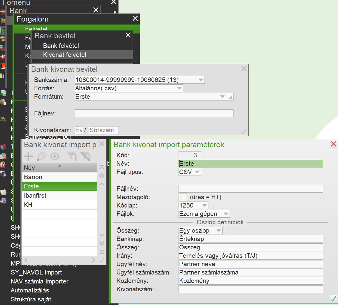 A bank Kivonat felvétel menüpontban Általános (csv) forrás készült. Ezt választva beolvasási sablonokat lehet készíteni, melyekben megadhatók a beolvasandó mezők machinátoros megfelelői (a CSV fájlok mezőneveit kell használni), a kódlap, a mezőhatároló, valamint a forrás fájl helye. |