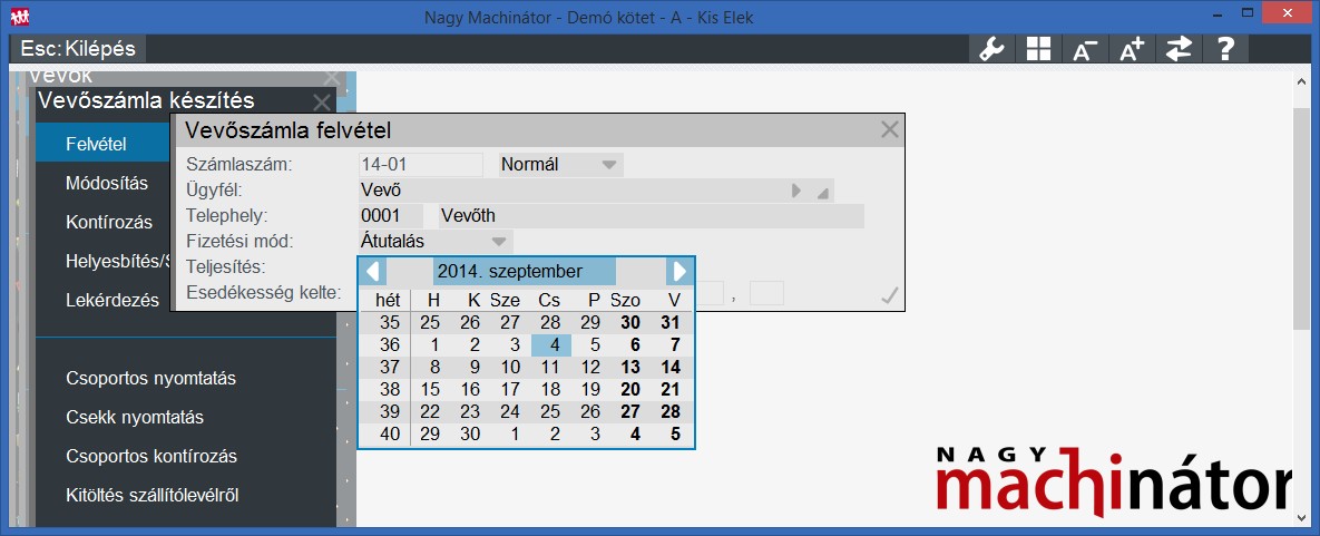 A Dátum mezőkön ezentúl a Kereső gomb (F2) megnyomása után megjelenik a naptár. A Dátum mezőn gyors dátum bevitelt lehet elérni: "m" betű = ma, "h" betű = holnap, "t" betű = tegnap |