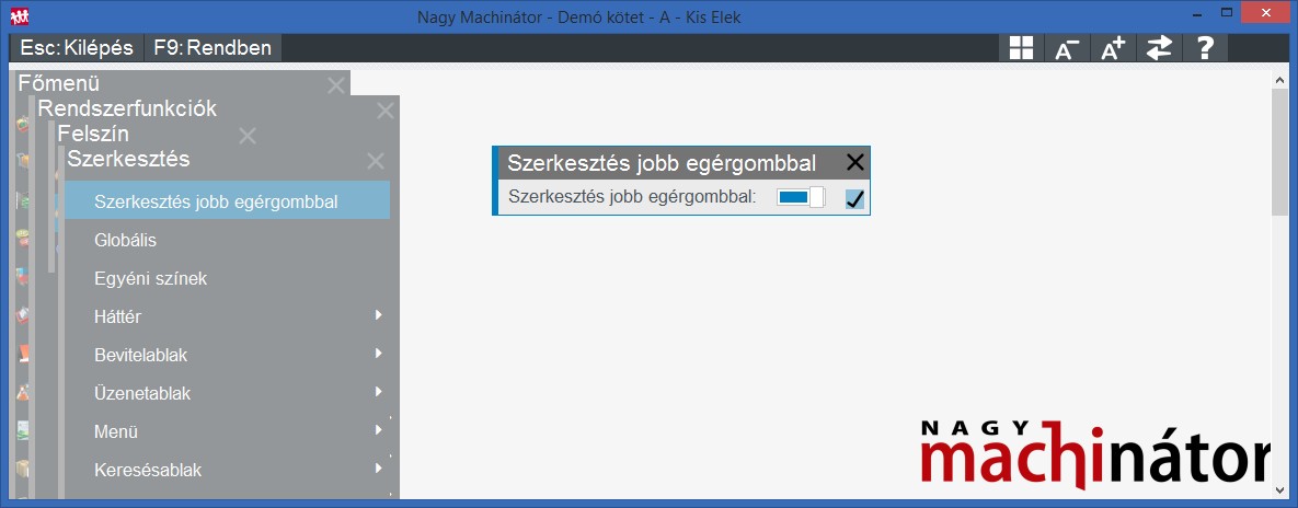 Lehetőség van a felszínek munka közben történő szerkesztésére. Ehhez az alábbi képen látható menüpontban kell bekapcsolni a Szekesztés jobb egérgombbal kapcsolót. A Szekesztés jobb egérgombbal bekapcsolása után a felhasználó munka közben az egérrel rámutat a módosítandó objektumra és az egér jobb gomb megnyomása után módosíthatja az objektumot. |