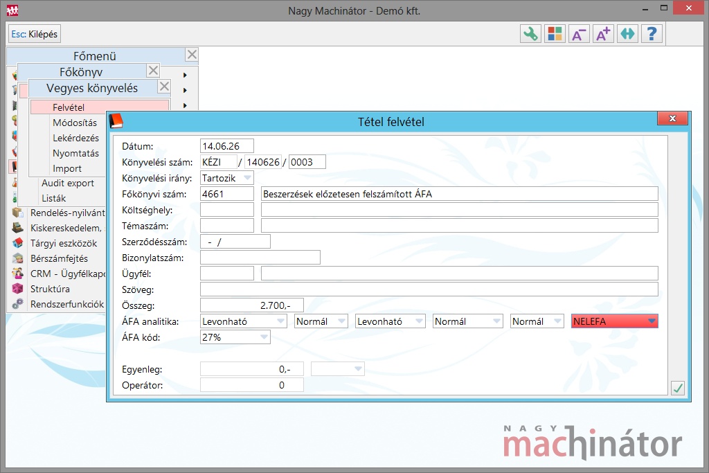 A Főkönyvben, vegyes könyvelési tétel rögzítésekor lehetőség van az Áfához beállítani, hogy NELEFA vagy nem. |