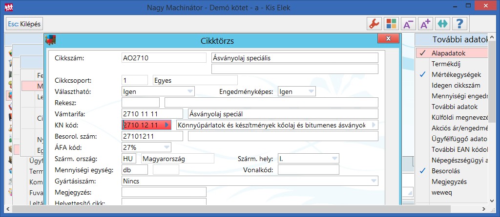A komplett KN kód törzs a frissítéssel kerül a programba. Ha a KN kód nincs megadva a cikktörzsben, akkor a vámtarifaszám kerül az adatszolgáltatásba. |