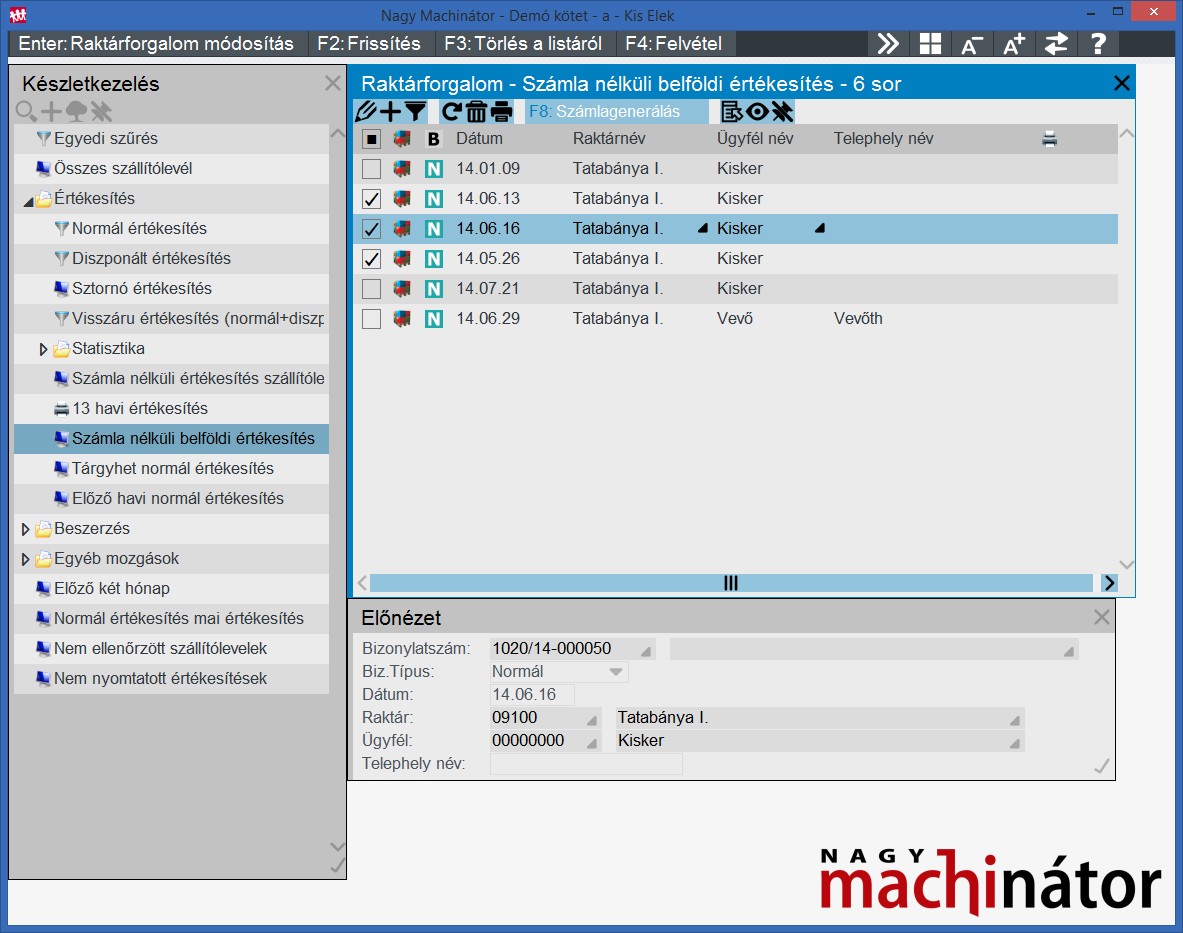 A raktárforgalom szűrésből lehetőség nyílik a számlagenerálásra. |