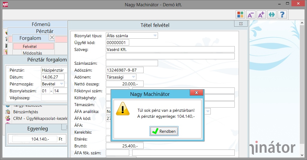 A pénztártörzsben minden pénztárhoz be lehet állítani egy egyenleg limitet, a limit elérésekor a beállítástól függően tilt vagy figyelmeztet a program |
