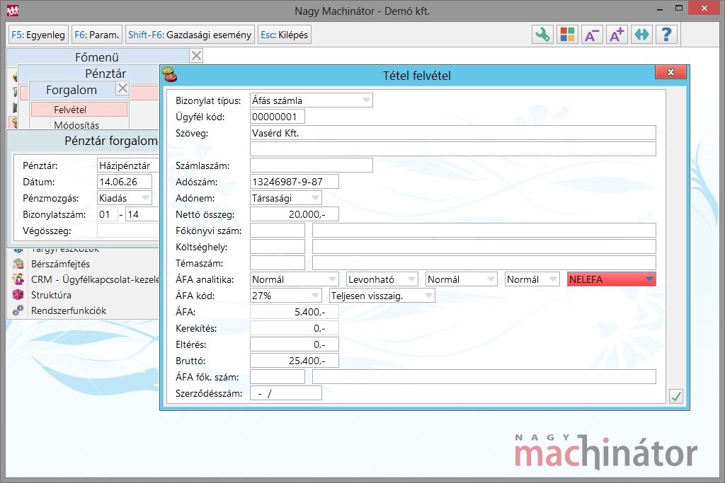 A Pénztárban kiadás irányú pénzmozgás rögzítésekor az Áfához beállítható, hogy NELEFA vagy Nem NELEFA. Ha Nem NELEFA, akkor az Áfa bevallás 31. sorába kerül be a tétel. |