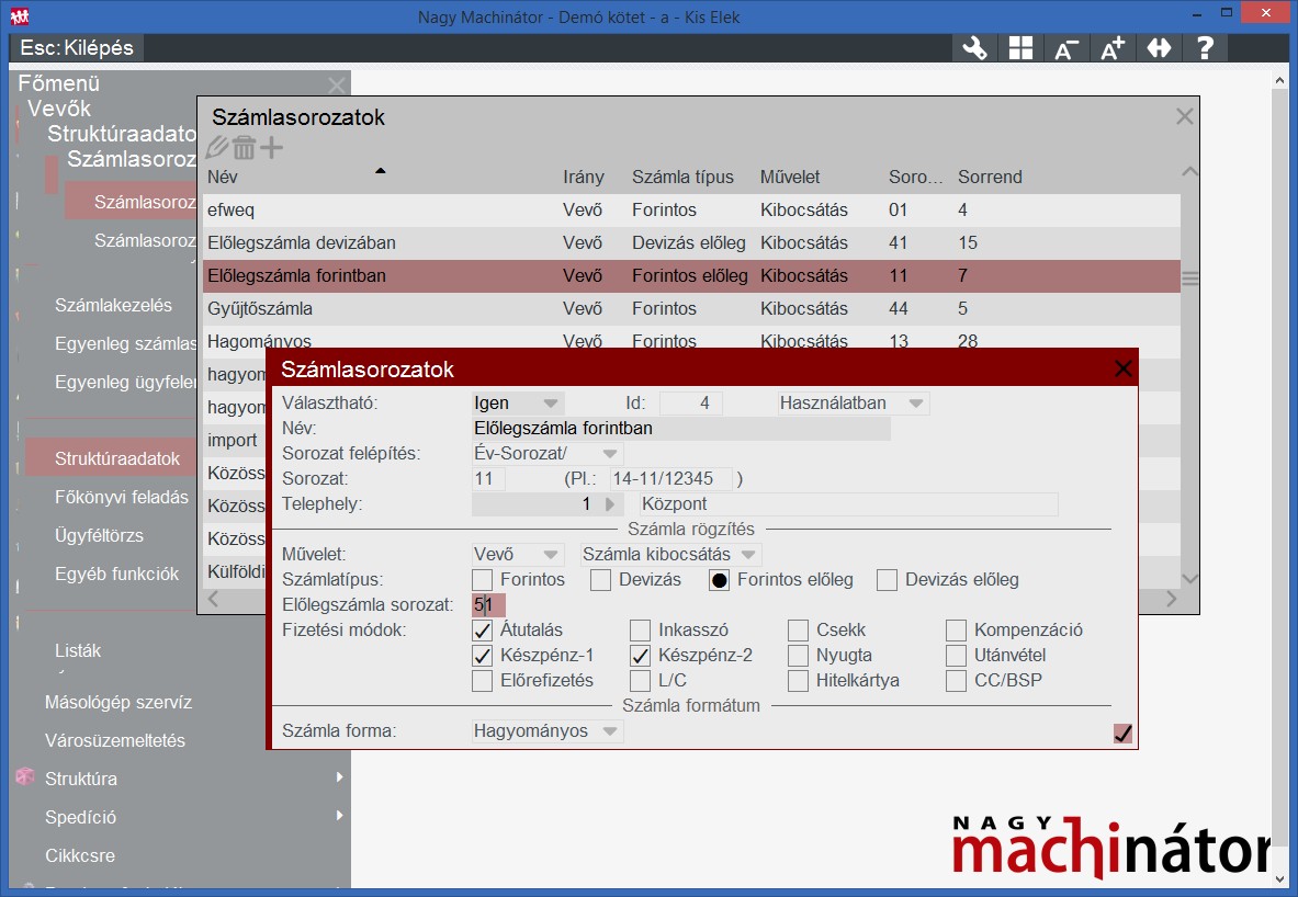 Ezentúl lehetőség van arra, hogy a Terhelési értesítő sorszámától függetlenül legyen az Előlegszámla számlának képzése. A számlasorozat funcióban lehet előre definiálni, hogy az előlegbekérőt és az előlegszámlát milyen sorozatszámon vezesse a program. Amennyiben az előlegszámla sorozatszámát nem adják meg, az előlegszámla nyomtatása során nem képez új sorszámot a program. Ezt a módszert azok alkalmazhatják, akiknek elegendő, ha az előlegbekérők sorszáma folyamatos. |