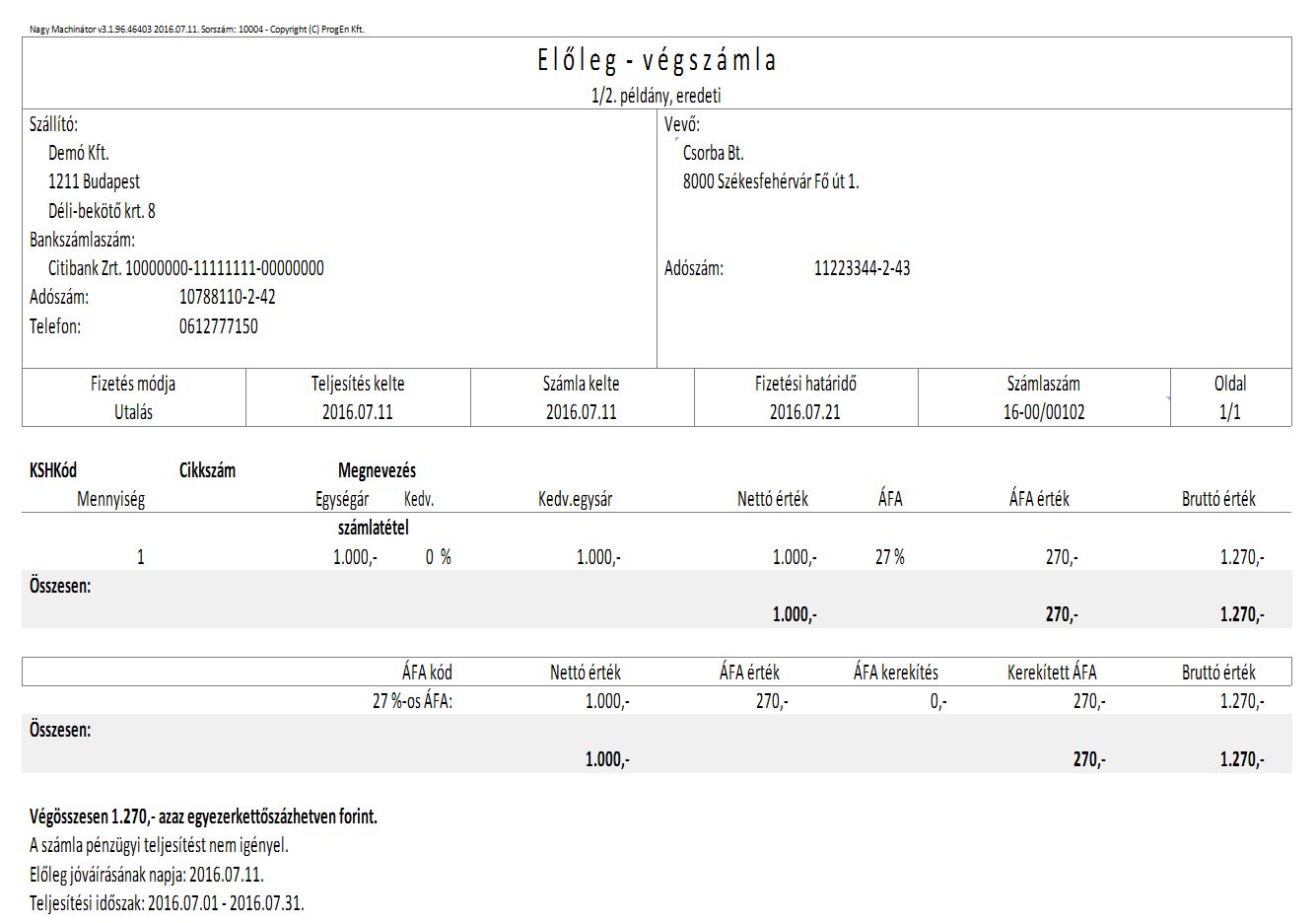 Az Áfa tv.59§-ből következően, ha a számlázás időszaki elszámolás alapján történik, és a számlára 100% előleget fizetett a vevő az elszámolási időszak vége előtt, akkor elég egyetlen bizonylatot kiállítania a szolgáltatónak. Ez a bizonylat az előleg-végszámla. |