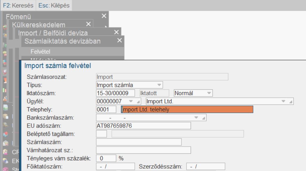 Az import számla kezeli a telephelyet. Amennyiben a választott telephelyhez meg van adva EU adószám, az kerül beemelésre a számla fejlécébe. |