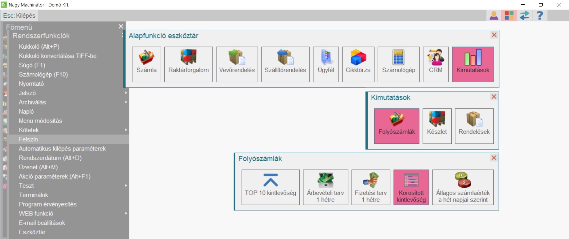 Az Eszköztárba új alapkimutatások kerültek, melyek átfogó képet képesek nyújtani cégünk pénzügyi, ill kereskedelmi helyzetéről. A kimutatásokban használt szűrések az egyes érintett modulokban (számla, készlet, rendelés) önállóan is használhatók, ill. saját szűrések is elhelyezhetők a Progen által ajánlott alap eszköztár másolásával készíthető saját eszköztárba. A használt szűrések konkrét ügyfélre vagy cikkre is alkalmazhatók, pl. a fenti példában látható korosított kintlévőség vevőszámla szűrés egy adott ügyfél törzsadataiból is elérhető. |