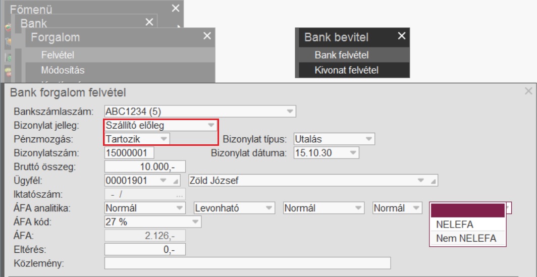 Megváltozott a szállítói előleg visszautalás az áfa bevallás szempontjából. A program ebben az esetben is kezeli már a NELEFA fogalmát. Alapértelmezés szerint (NELEFA) az Áfa tv. 153/C. § alapján a 31. sorba kerül pozitív értékkel az összeg, de ez felülbírálható (Nem NELEFA). |