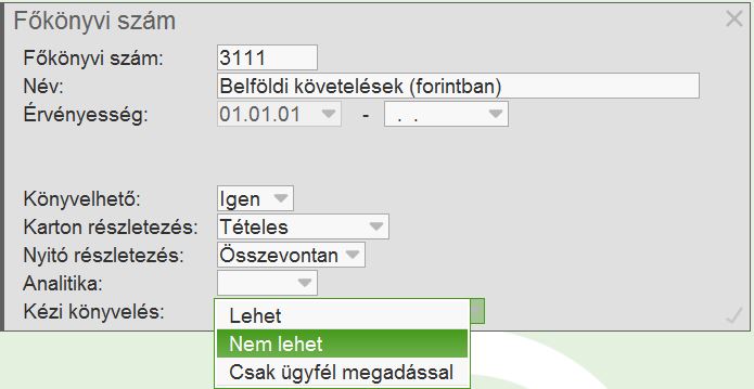 A főkönyvi számoknak új tulajdonsága lett: Kézi könyvelés: Lehet / Nem lehet / Csak ügyfél megadással Azt szabályozza, hogy vegyes könyvelésben az adott főkönyvi szám használható-e, ill. ha igen, kötelező-e megadni hozzá ügyfelet. A beállítás az analitika-főkönyv összehasonlítás, ill. az eltérés keletkezés megakadályozásának szerves része lehet. |