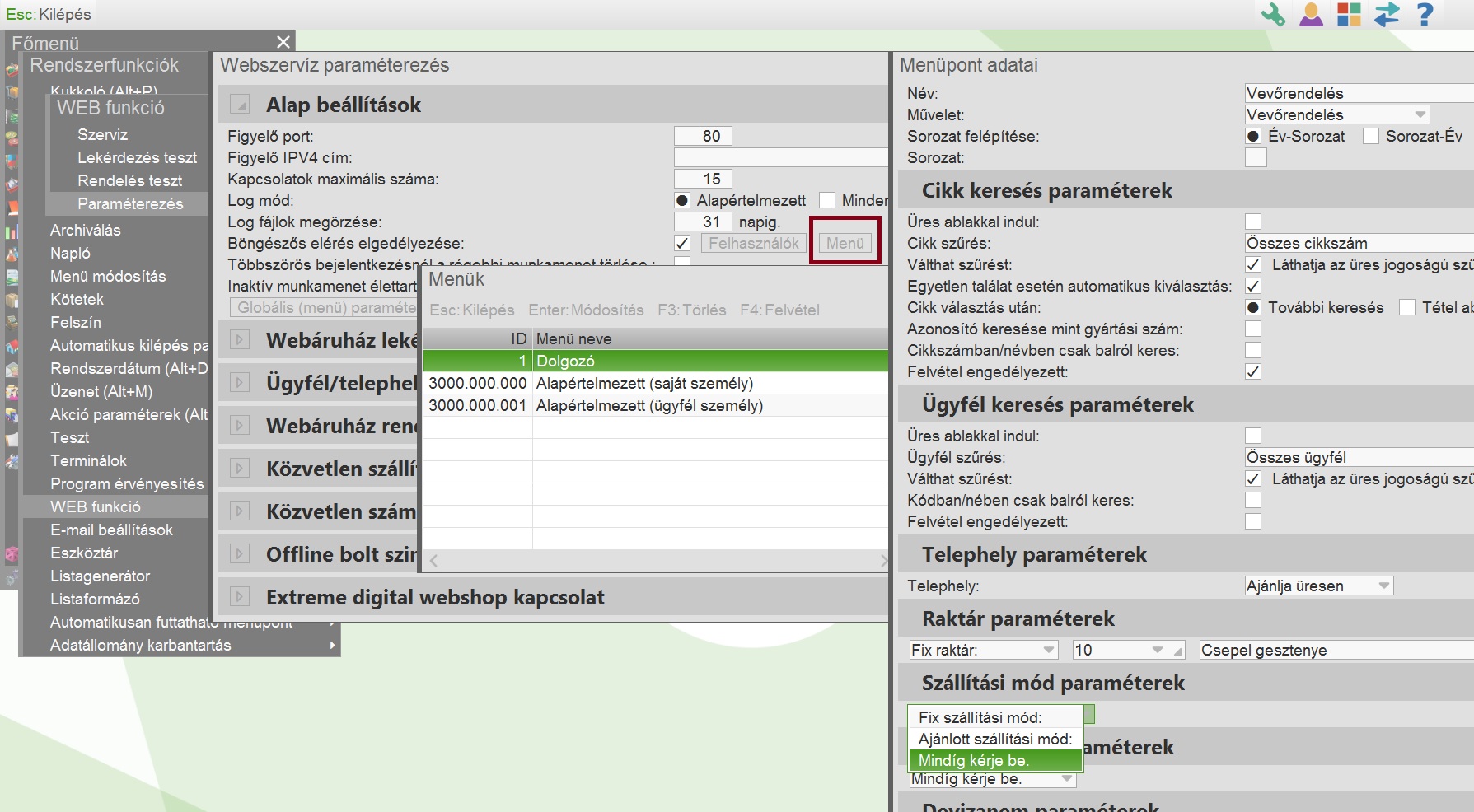 Paraméterezhető, hogy mi legyen a webáruházból betöltött rendelések alapértelmezett szállítási módja, valamint a böngészőből elérhető webes Machinátorban rögzített rendelések hogyan használják az alapértelmezett szállítási módot. |