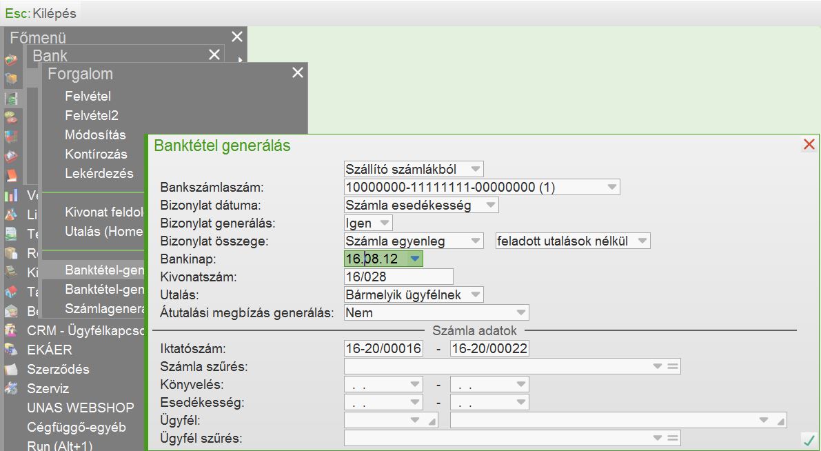 Banktétel generálásban Banki nap és Kivonatszám |