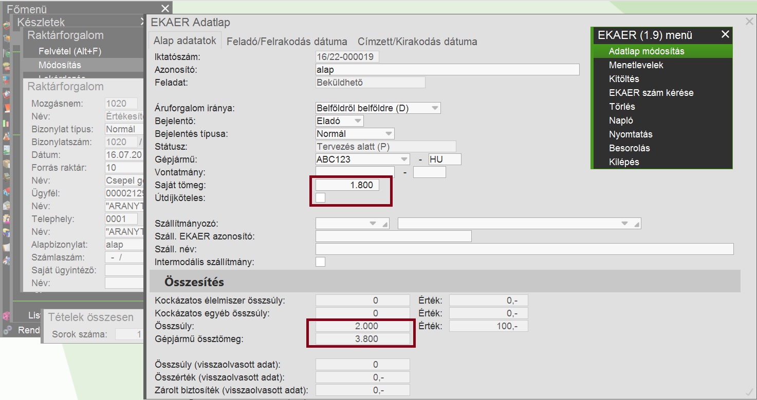 Szállító jármű önsúly az EKAER-ben |