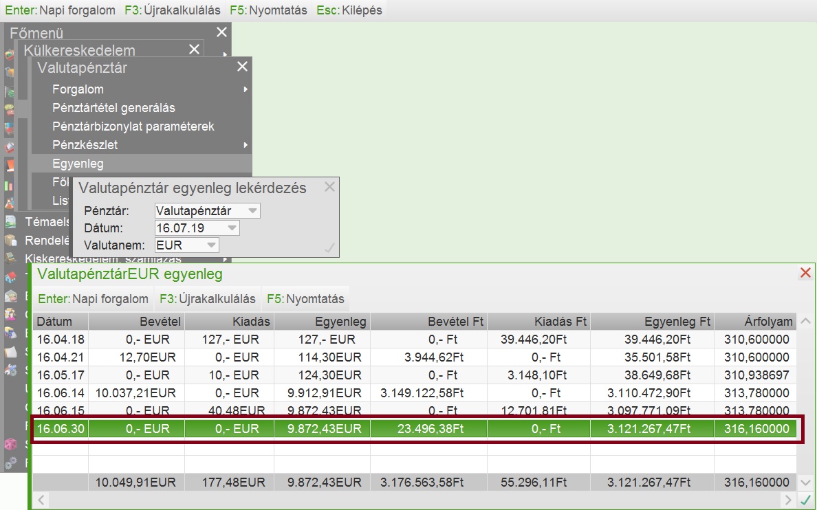 A hó végi árfolyam átértékelésről (DPÁK könyvelési tétel) a pénztár egyenlegébe is bejegyzés kerül, így a főkönyv az átértékelés után is egyezni fog a pénztáregyenleggel. Érdemes a friss programot használva a teljes évet újra feladni. |