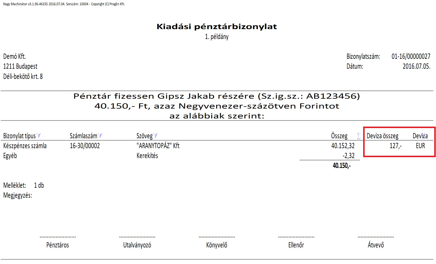 Készpénzes számla típusnál ha devizás számlát választunk, és nem töltjük ki a Forint összeget, a számla kiválasztása után a program beajánlja a devizás összeg mezőbe a kiválasztott számla devizás egyenlegét, majd a tárgynapi választott devizaárfolyammal visszaírja a forint mezőbe a forintosított összeget. Ha beírtuk a Forint összeget, az nem változik meg a számla beválasztása után sem. Elkészült egy formázott pénztárbizonylat, mely meg tudja mutatni a devizaszámlában kiegyenlítésre kerülő összeget és annak devizanemét. |