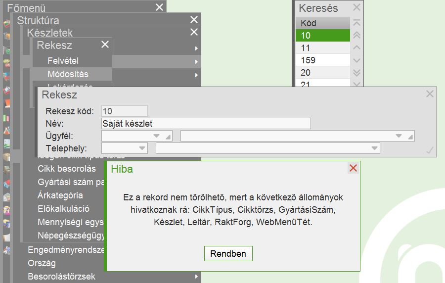 Raktárt, rekeszt, cikkcsoportot és mozgásnemet nem lehet törölni, ha van rá hivatkozás forgalmi adatokban, erre üzenet figyelmeztet, felsorolva az érintett állományokat. A cikk- és ügyféltörzsből korábban sem lehetett az ilyen tételeket törölni, most itt is megjelenik a fenti üzenet az érintett állományokról. |
