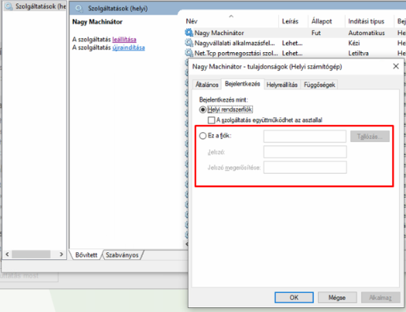Amennyiben helyi rendszerfiókkal történt a bejelentkezés lehet, hogy nem ér el minden szolgáltatást a machinátor, amire szüksége van.