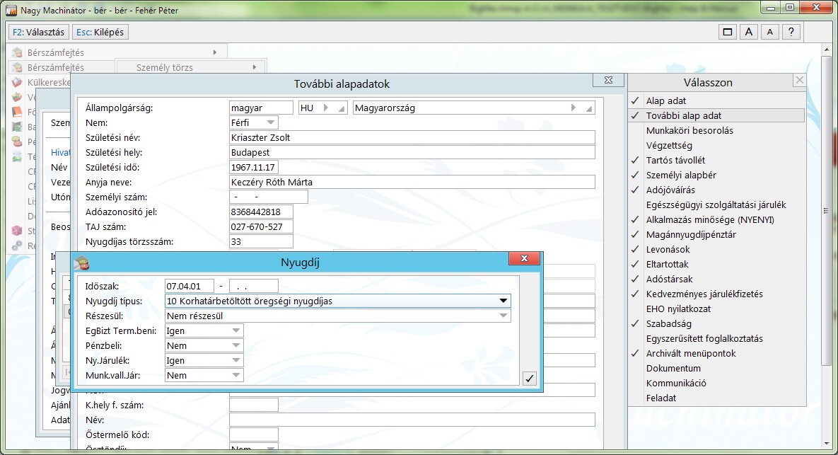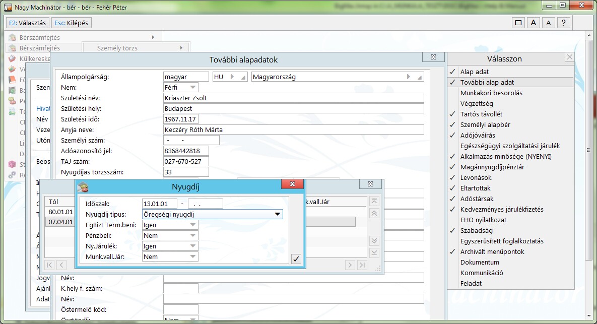 Akik már 2018.12.31-én nyugdíjasok voltakAzoknál a személyeknél, akik már 2019 előtt saját jogú nyugdíjasok voltak, vagyis a nyugdíjas státuszuk 2019.01.01 előtt rögzítésre került a Machinátorban, ott nincsen teendő. A program automatikusan a munkaviszonyban álló (20-as alkmin) és saját jogú nyugdíjas (7-es vagy 8-as kódon rögzített) esetében nem vonja le a játulékokat és a munkáltatói terheket, csak SZJA előleget fog számfejteni.