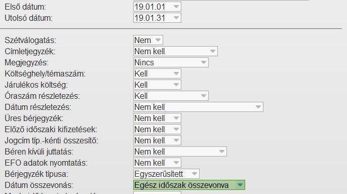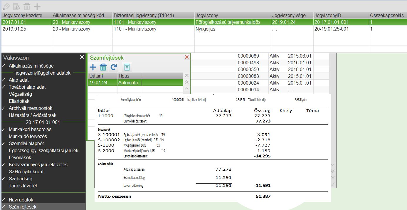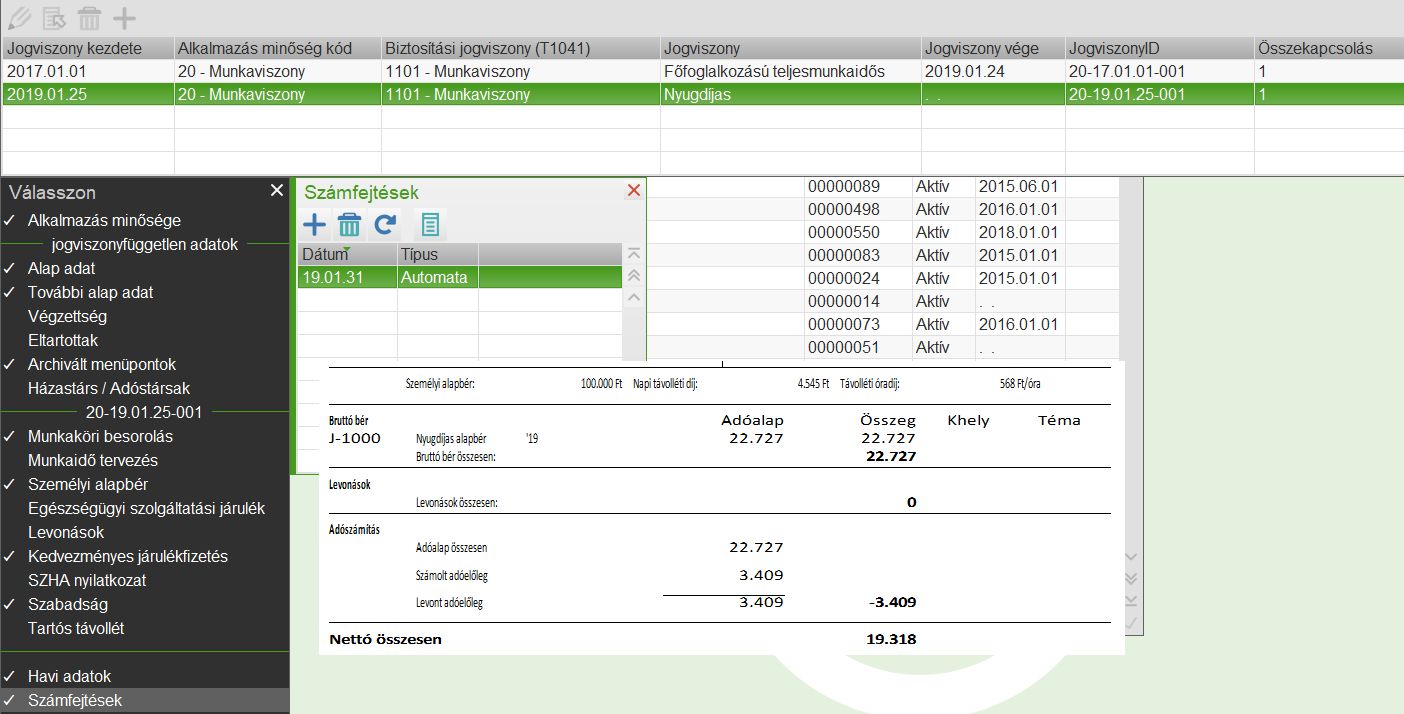 Akik 2019 január 1. után lesznek nyugdíjasokAmikortól a dolgozó jogosult a nyugellátásra, fel kell venni a Személy törzs / További alapadatok menüpontban a jogosultság kezdetét. Ekkor a program figyelmeztet, hogy a megváltozott számfejtés miatt új jogviszonyt kell felvenni, és az Igen gombot megnyomva a program fel is veszi automatikusan az új jogviszonyt. A jogviszony függő adatok (munkakör, kedvezményes járulékfizetés, személyi alapbér, stb.) automatikusan másolásra kerül, valamint a két jogviszony összekapcsolt lesz. Ezután a technikailag lezárásra került jogviszony végére, és hó végére is kell egy számfejtést futtatni. Amennyiben egy bérjegyéken szeretnénk látni a dolgozó havi bérét, a bérjegyzék lekérésekor lehetőség van beállítani, hogy az egész időszakra összevontan mutassa a lista az adatokat: Azonban vegyük figyelembe, hogy ekkor a bruttó összeg az adott százalékkal megszorozva nem fogja matematikailag helyesen mutatni a levont járulékokat és járulékos költségeket, hiszen a bér egy részéből ezek levonásra kerülnek, míg a másik részéből nem! |