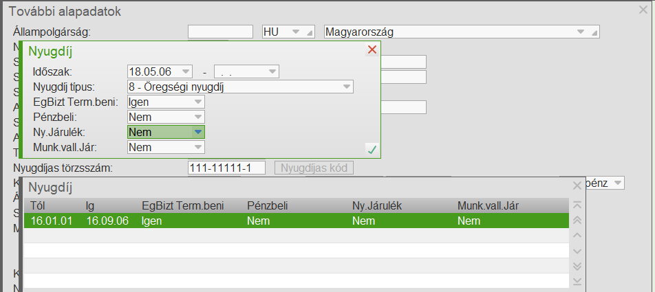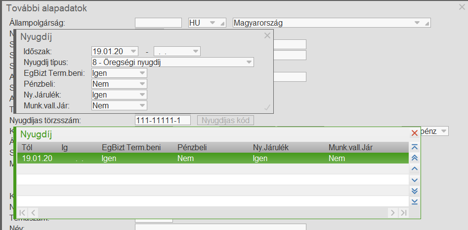 A Személytörzs / További alap adatok menüpontban a Nyugdíjas törzsszám mezőre kell állni és a törzsszám kitöltése után az F4-Részletezés gomb megnyomása után megjelenő ablakban kell megadni a nyugdíjba vonulás időpontját és a nyugdíjas státusz kódját.
