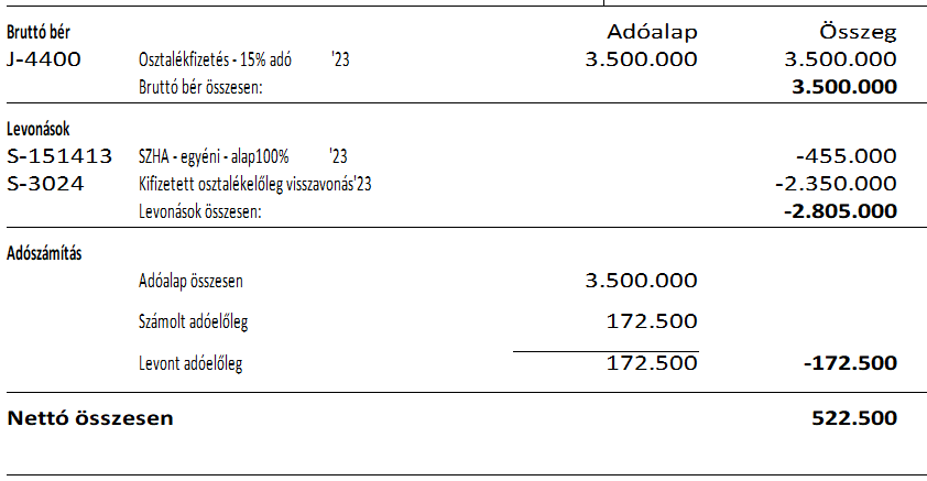 Amikor a jóváhagyott osztalék kerül kifizetésre, akkor a már kifizetett osztalékelőlegek alapján megfizetett SZJA-val csökkentett SZJA-t és SZOCHO-t kell fizetni.