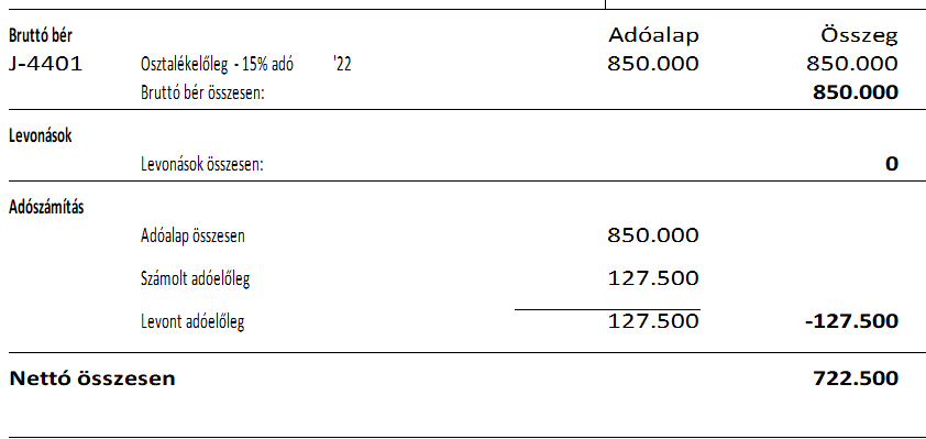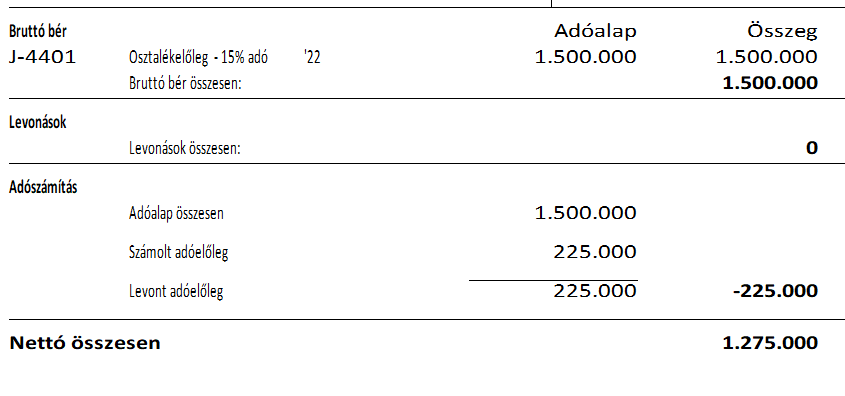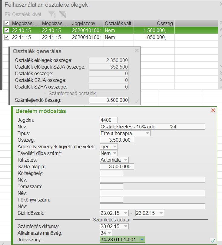 Az osztalékelőlegek felvételekor a számfejtett összegekre SZJA kerül számfejtésre.