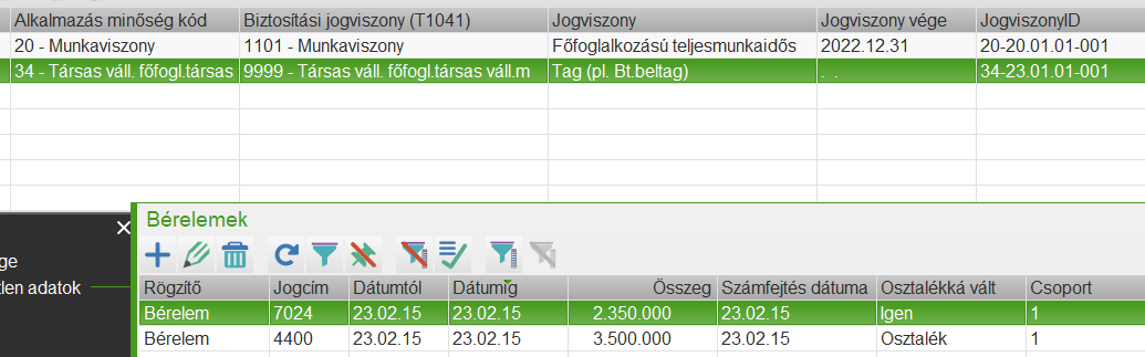 A bérelem lezárásával visszalépünk a gridbe, ahol megjelenik a felvett osztalék bérelem, valamint a leszűrt osztalékelőlegek "osztalékká vált = igen" állapotba kerülnek.