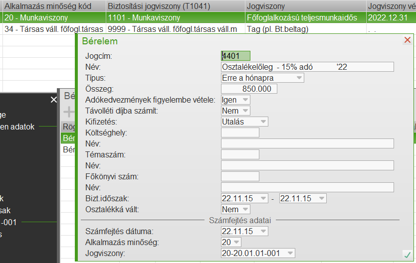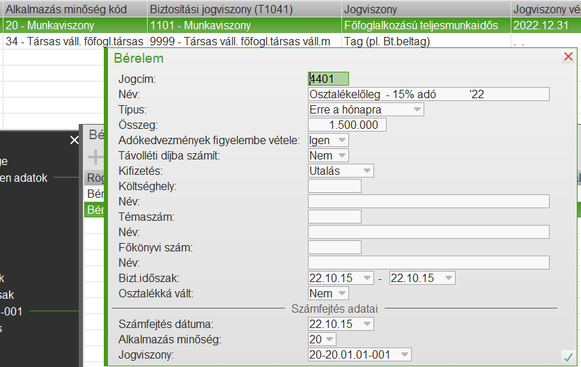 Az ablak elfogadásával létrejön egy 4400-as bérelem a megadott összeggel, nekünk csak a dátumokat kell kitöltenünk