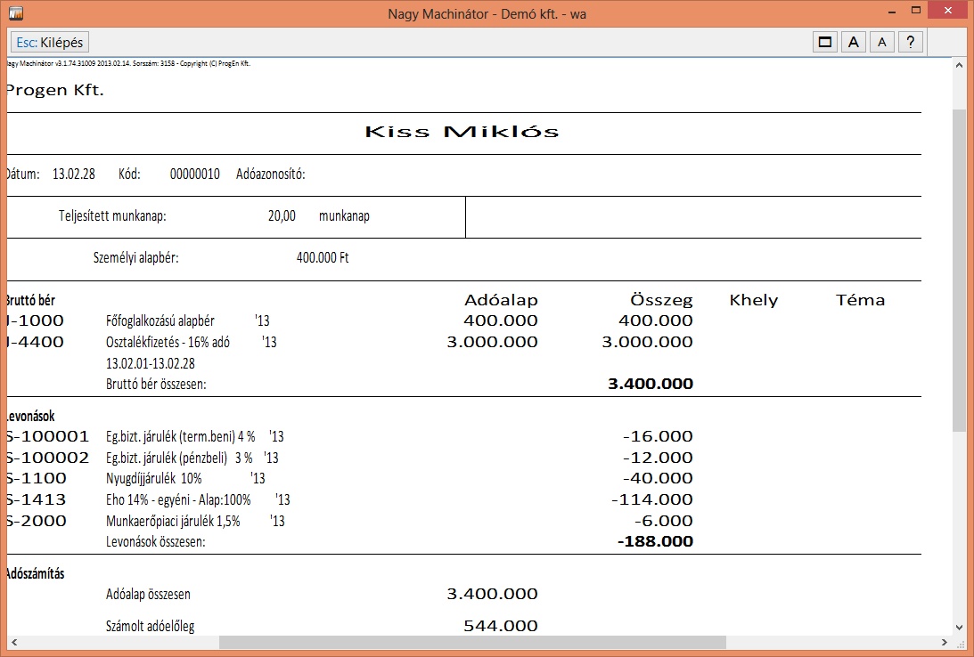 Példa: A munkavállaló személyi alapbére ebben az évben 400.000 Ft/hó. Osztalékfizetés jogcímén 3 millió Ft-ot kap februárban. Feltételezzük, hogy a személyi alapbére nem fog az évben változni. Így az ezután fizetendő éves egészségbiztosítási (természetbeli és pénzbeli) járuléka (7%): 28.000 x 12 = 336.000 Ft. Az osztalékfizetés után fizetendő EHO 420.000 Ft lenne. Azonban az éves felső határ (450.000 Ft) miatt elegendő tőle 114.000 Ft EHO-t vonni. Ezt úgy érhetjük el, hogy az EHO alapja mezőbe 814.286 Ft-ot írunk.