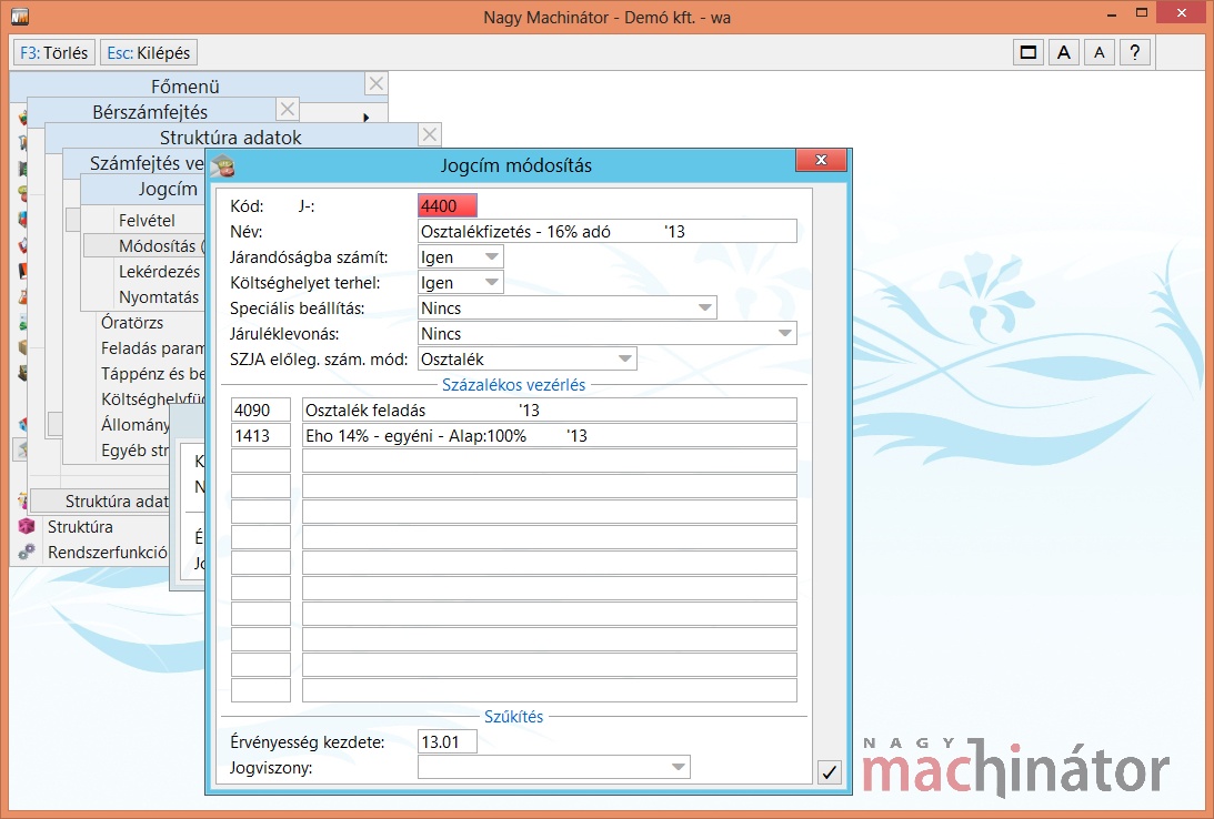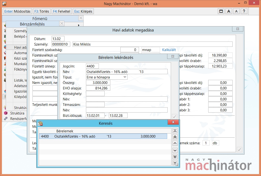 A havi adatok megadása során bérelemként kell rögzíteni az osztalékfizetésből származó bevételt. Az osztalékfizetést a J4400, míg az osztalékelőleget a J4401 jogcímen kell számfejteni. Az bérelem felvétele során az Összeg mezőbe a hónapban számfejtendő bevétel összege kerüljön. Az EHO alapja mezőbe azt az összeget kell megadni, ami után a program EHO-t számfejtsen.